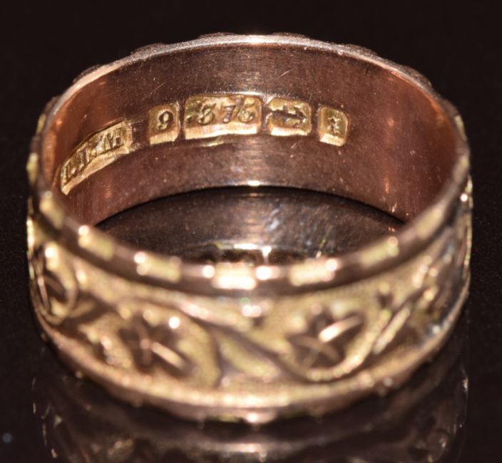 Victorian 9ct gold ring with ivy decoration, Birmingham 1880, 3.1g, size K