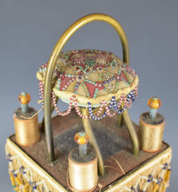 19th/20thC tiered cotton reel stand with pin cushion surmount, with beaded and fringed decoration, some reels with 'Best Silk', height 40cm
