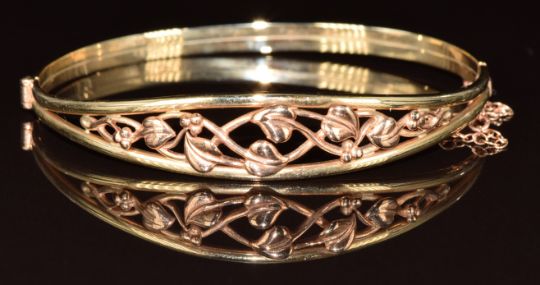 Clogau 9ct gold bangle with pierced foliate decoration, 11.1g, 5.7 x 5.3cm