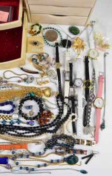A collection of costume jewellery including silver chain, freshwater pearl bracelet, silver pendant, vintage brooches, glass beaded necklace, 9ct gold clasps, a silver bracelet with threepence coins, etc