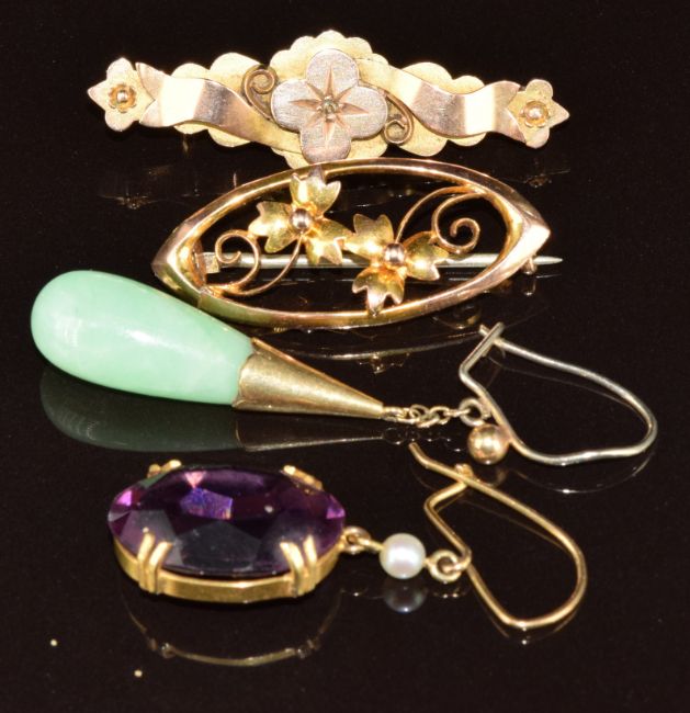 Edwardian 9ct gold brooch set with a diamond, Birmingham 1903, a 9ct gold brooch (4g) and two single 9ct gold earrings, one set with an amethyst and pearl and the other jadeite