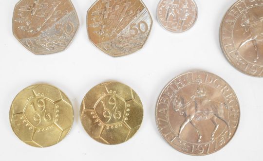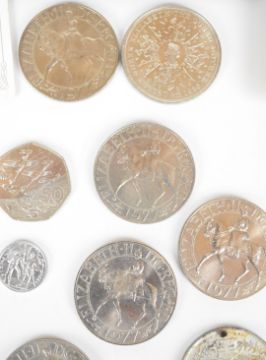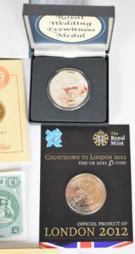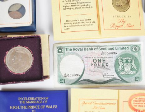 A collection of various commemorative medals and crowns etc, Queen Victoria onwards includes Canada Quebec dollar 'eyewitness Royal Wedding' medal coin, in fitted case with certificate, presentation pack examples Tercentenary and football £2 coins, £5 crowns etc