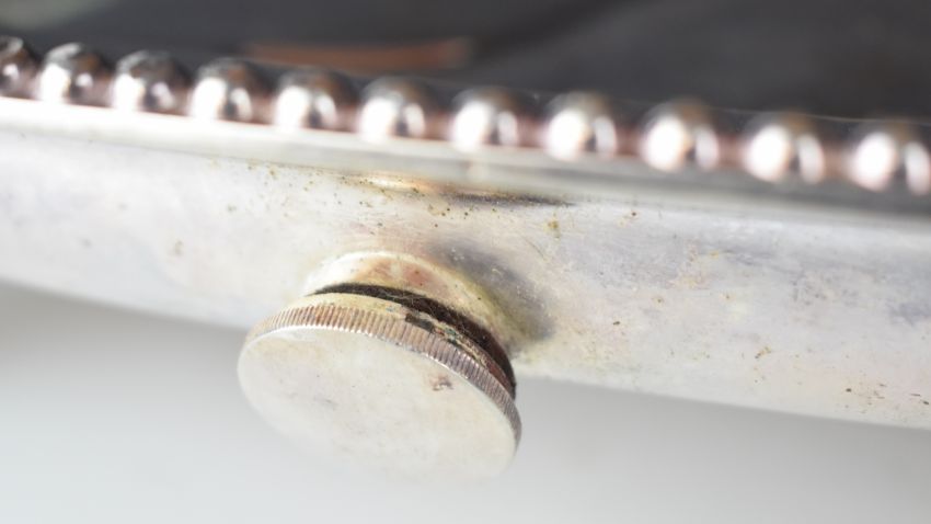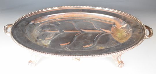 James Dixon & Sons Victorian silver plated meat platter with heated base, twin handles and four ornate feet, length 61.5cm