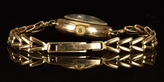 Unnamed 9ct gold ladies wristwatch with blued hands, black Roman numerals, gilt minute markers, white dial and unsigned movement, on 9ct gold bracelet, case diameter 26mm, serial number 33168, 18.8g.