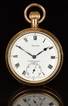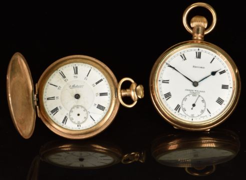 Two gold plated pocket keyless winding pocket watches, one Record for James Walker of London open faced the other J Fleischmann of Vancouver full hunter, largest case diameter 51mm.