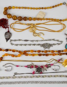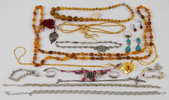 A collection of jewellery including silver earrings, Continental and Trifari necklaces, Trifari bracelet, silver ring, silver and marcasite necklace, etc