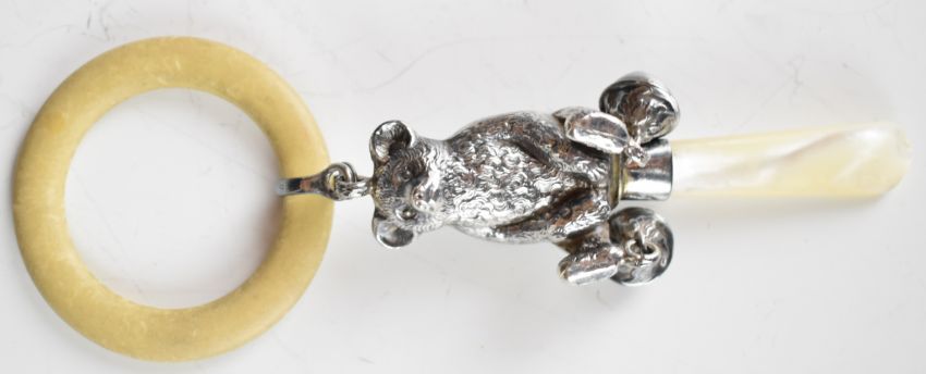 Hallmarked silver novelty baby's rattle with mother of pearl handle and teddy bear body, Birmingham 1933, maker Crisford & Norris Ltd, length 14.5cm