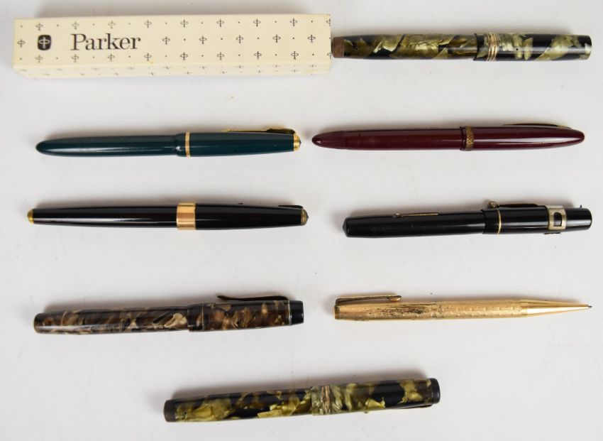 Collection of vintage fountain pens including Swan, Sheaffer, Unique Junior, Parker including '17' etc