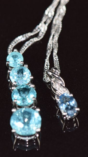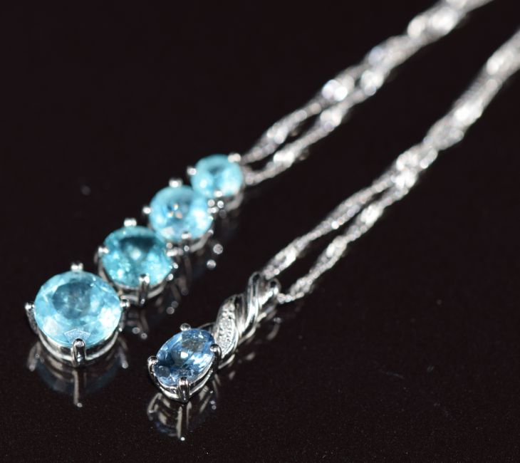 An 18k white gold pendant set with blue tourmaline and a diamond (0.8g) and a 9ct white gold pendant set with graduated round cut zircon, on 9ct gold chain (2.7g), 45cm