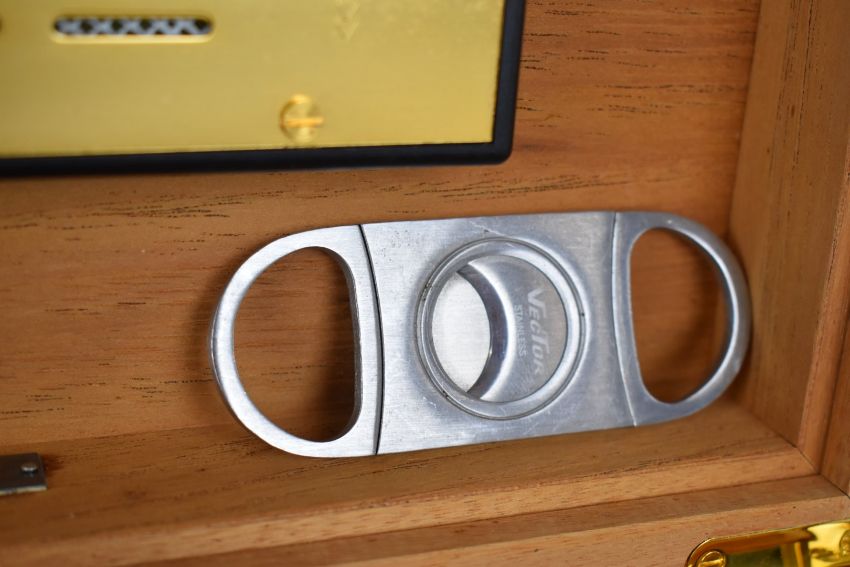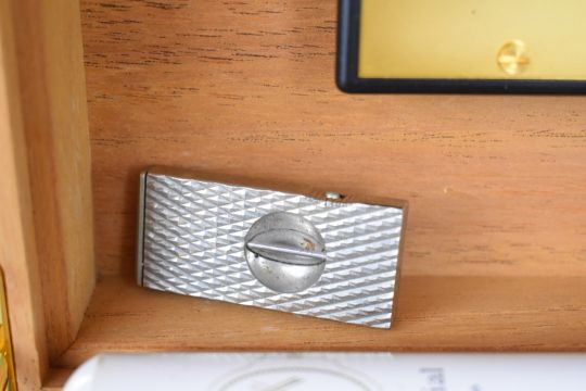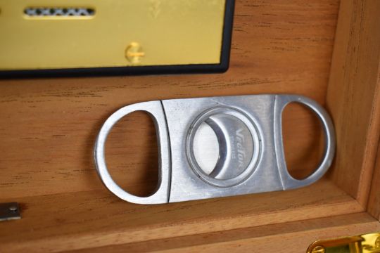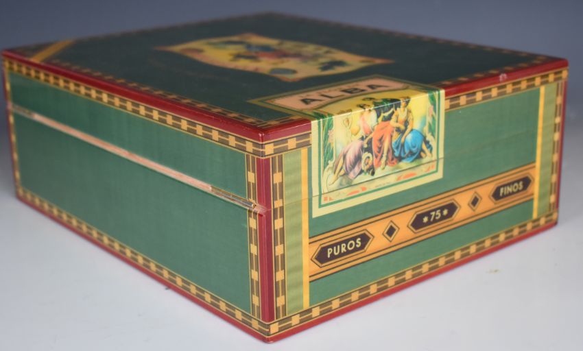 Elie Bleu cigar humidor with 'La Fleur Alba, Fabrica De Tabacos, Puros Finos' cigar box advertising decoration with cigar cutters and key, W20 x D14 x H12cm