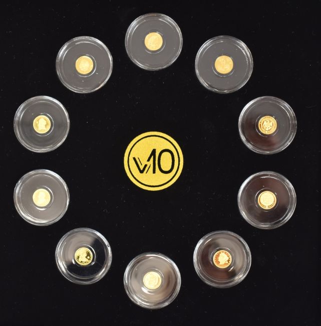 'Valuable 10, The Most Valuable Coins In The World', cased set of ten limited edition 1144/2500 .9999 gold coins, each 0.5g, with hardback booklet
