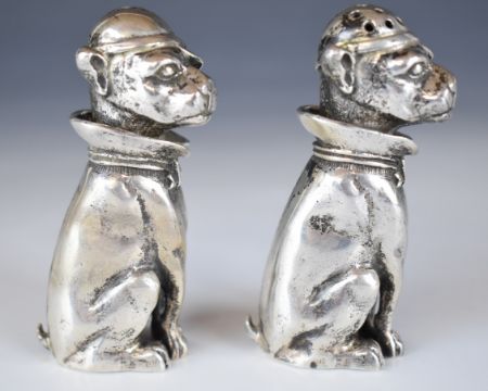 Pair of novelty silver peppers formed as seated dogs in collared outfits with caps, marked 925 to bases, height 7.5cm, weight 200g