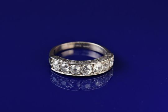 An 18ct white gold half eternity ring set with seven old cut diamonds graduating from 0.15ct to 0.2ct, 3.8g, size O