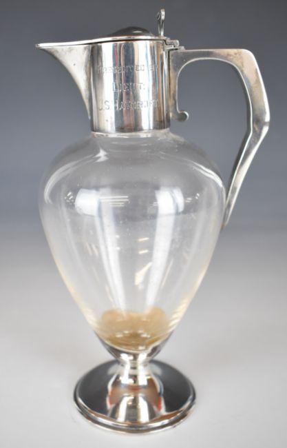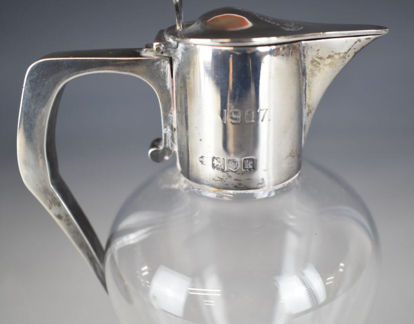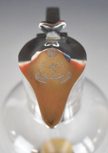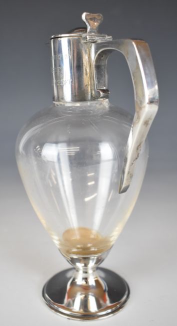 Edward VII hallmarked silver mounted glass claret jug with hinged lid engraved with crest for the 4th Battalion Royal Dublin Fusiliers and with inscription to Lieutenant J.S. Haycroft, London 1905, maker William Hutton & Sons Ltd, height 18.5cm