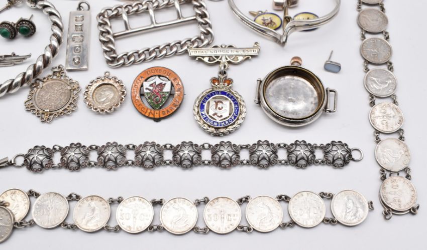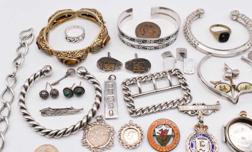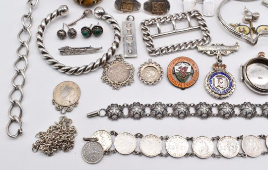 A collection of silver including Chinese filigree bracelet set with tiger's eye, four bangles, buckle, two Belgium coin bracelets, watch case, two bracelets, ring, cufflinks, ingot, Egyptian cufflinks set with guilloché enamel, etc