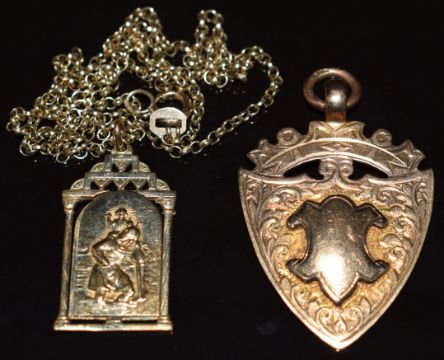 A 9ct gold fob, 9ct gold chain (7.3g) and rolled gold St Christopher