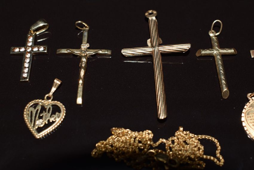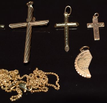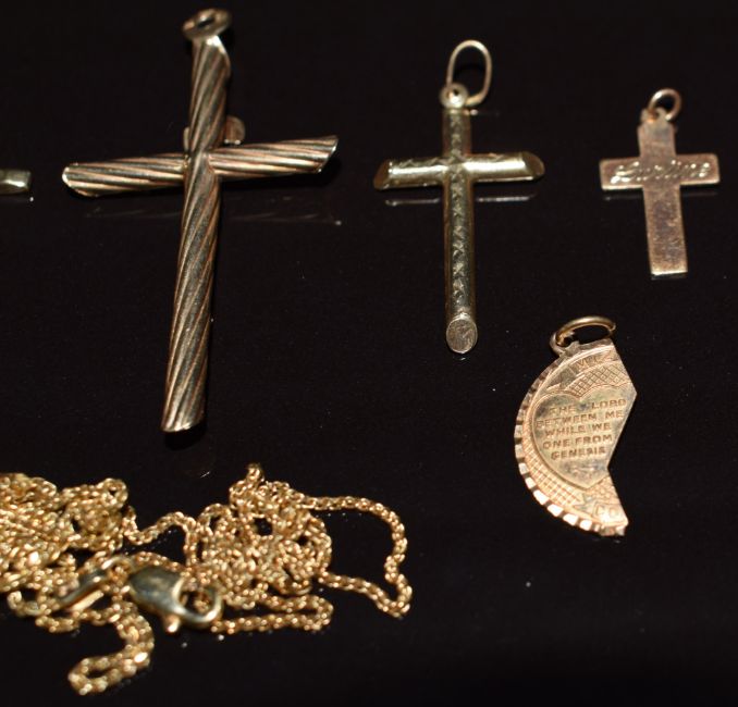 Five 9ct gold cross pendants, 'mother' pendant and a 9ct gold chain, 7.9g