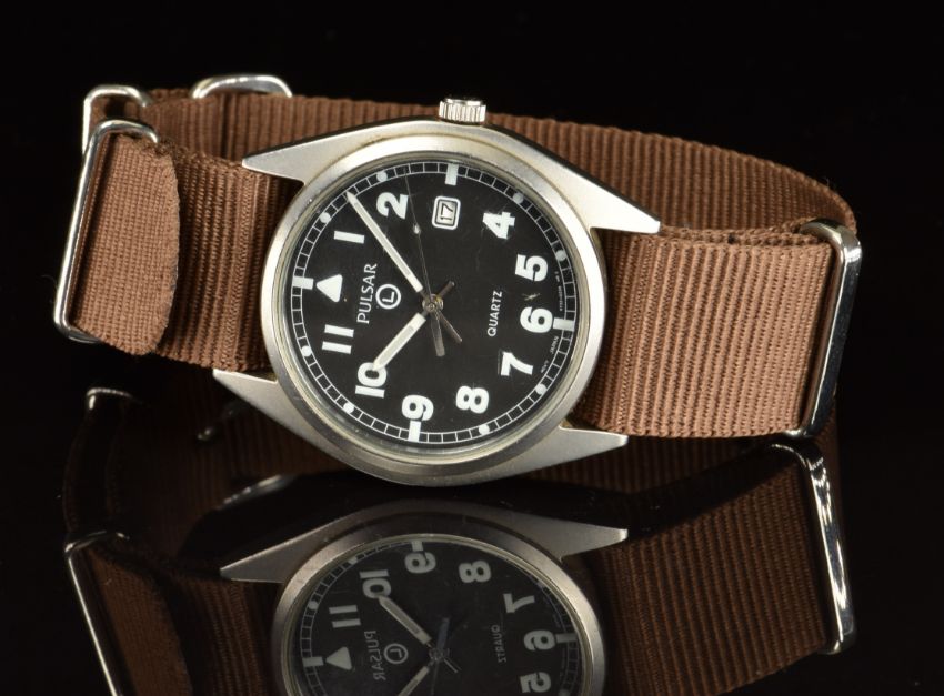 Pulsar gentleman's military issue wristwatch ref. V732-0L70 with date aperture, luminous hands and Arabic numerals, black dial, stainless steel case marked '6645-99 6052627' above broad arrow and quartz movement, on NATO style brown canvas strap, case diameter 36mm, serial number P10106/01.