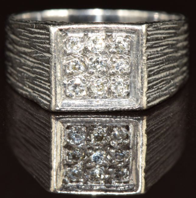 An 18ct white gold ring set with nine diamonds in a square setting, with textured shoulders, 6.2g, size J