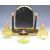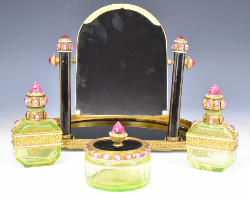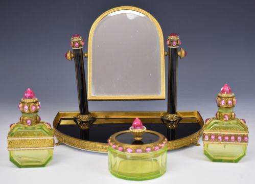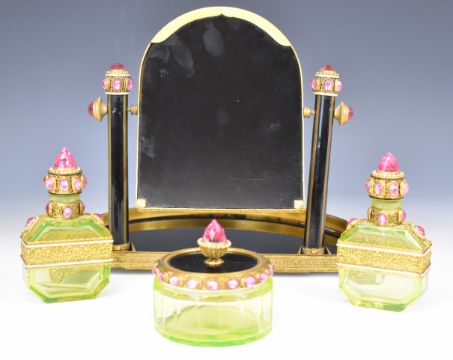 Emperor Tsar Nicholas II Russian interest gilt metal enamel and glass dressing table set comprising swing frame mirror and three vaseline glass bottles or pots, all set with cut pink glass and white enamel decoration, by repute formerly on the Russian royal yacht Standart. We sold, for the same vendor, two plates from the same yacht, the vendor being a descendant of Jonathan Holts shipping line Liverpool, height of mirror 25cm