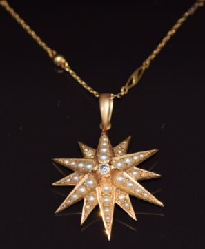 Edwardian 18ct gold pendant in the form of a star set with a diamond surrounded by seed pearls, on 18ct gold chain, 6.3g