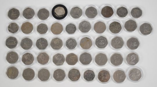 Forty five various collectable 50p coins to include Isle of Man, Ireland, St Helena, Gibraltar, Accession to EEC, larger 30mm Britannia examples etc