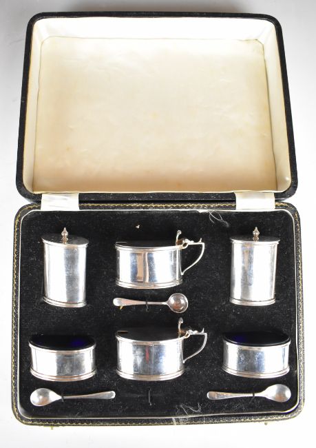 Cased Elizabeth II hallmarked silver condiment set comprising two each of pepper, salt and mustard, with three spoons to suit, Birmingham 1966, maker J B Chatterley & Sons Ltd, weight excluding blue glass liners 290g, width of case 25cm