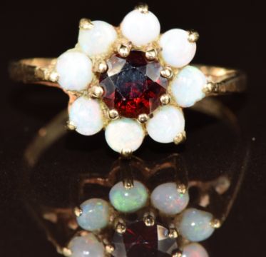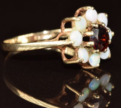 A 9ct gold ring set with a garnet surrounded by opals, 2g, size P