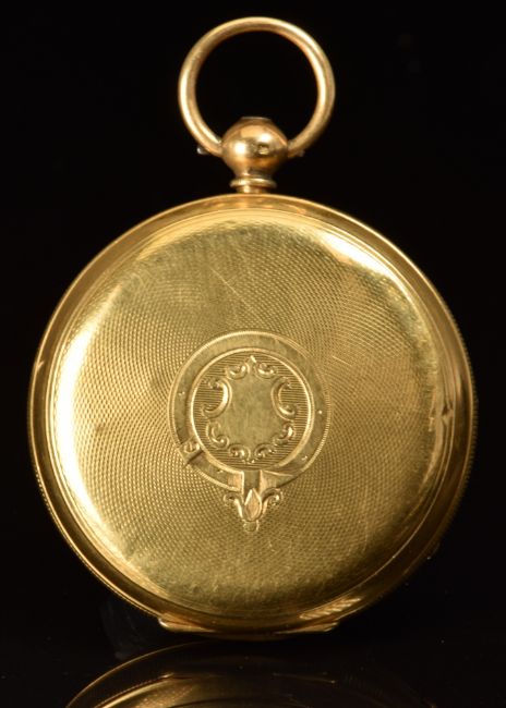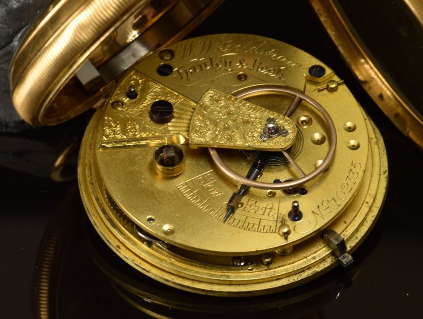 W W Goldshaw of Hanley & Leek 18ct gold open faced pocket watch with subsidiary seconds dial, gold hands, black Roman numerals, white dial, engraved case and signed and engraved movement, case diameter 49mm, serial number 102135, 97.8g.