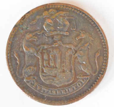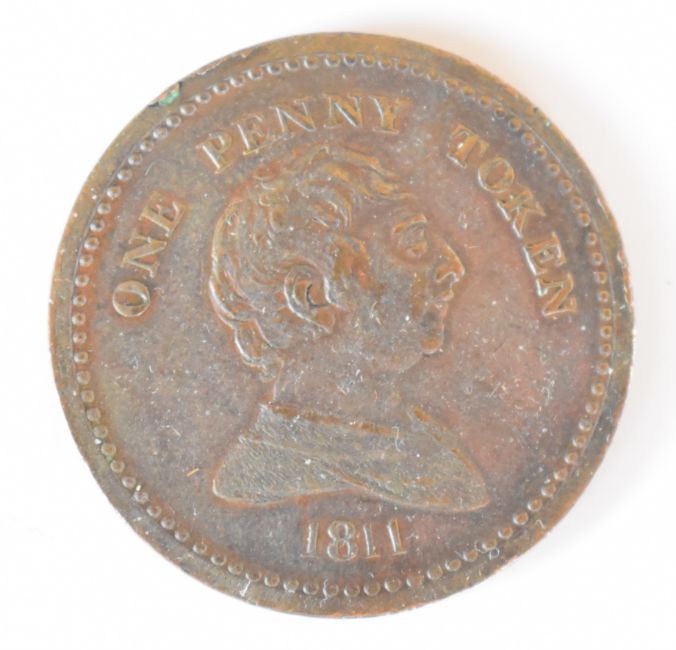 Cheltenham 1811 shilling token, 1811 Bristol penny token and a 1662 Bristol farthing
