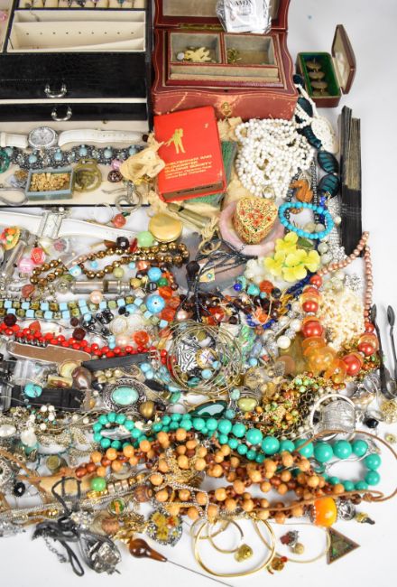 A collection of costume jewellery including 9ct gold cased watch, Miracle, Sphinx and vintage brooches, Jacobite pendant, , silver earrings, sodalite necklace, beads, etc