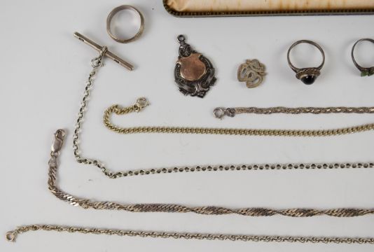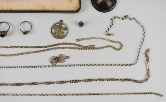 A collection of silver jewellery including curb link necklaces, three rings, chain, T bar, St Christopher, fob, bracelet, cup, etc and a Parker 61 pen and fountain pen in original box