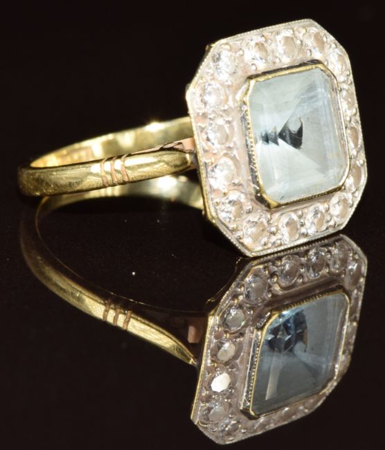 A c1930 18ct gold ring set with an emerald cut aquamarine of approximately 2ct surrounded by sixteen diamonds, each approximately 0.05ct, 4.8g, size N