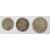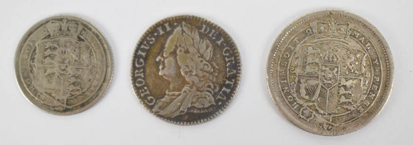 1757 George II sixpence together with an 1818 George III example and an 1816 shilling