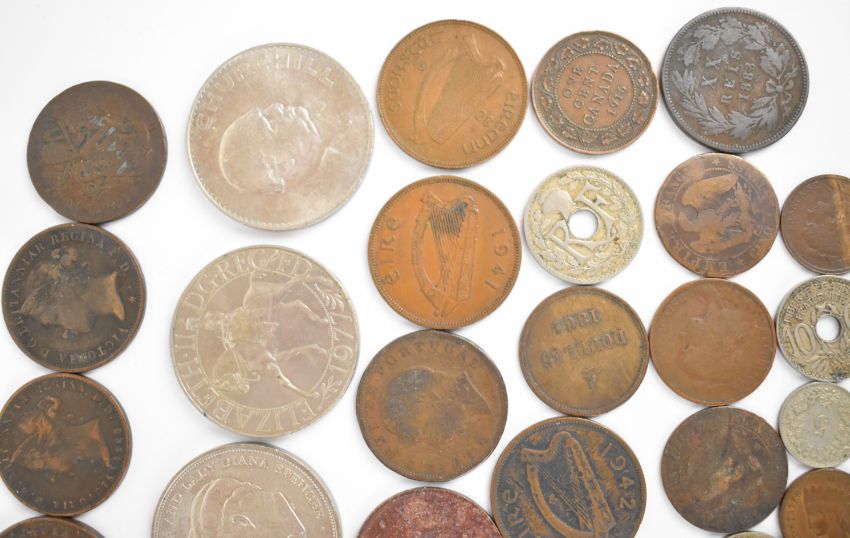 Approximately 160g of mixed UK and overseas silver coinage including Queen Anne Maundy 4d with hole, together with a quantity of interesting overseas etc coinage 19thC onwards together with some modern crowns