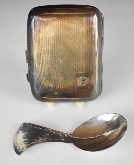 George V hallmarked silver cigarette case with engine turned decoration, Birmingham 1936, maker John Rose, length 8.5cm, weight 54g all in, together with a Keswick stainless steel or similar Arts and Crafts style caddy spoon