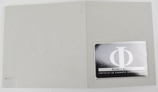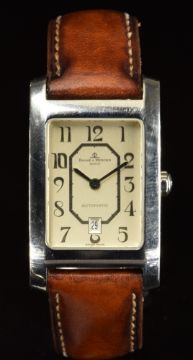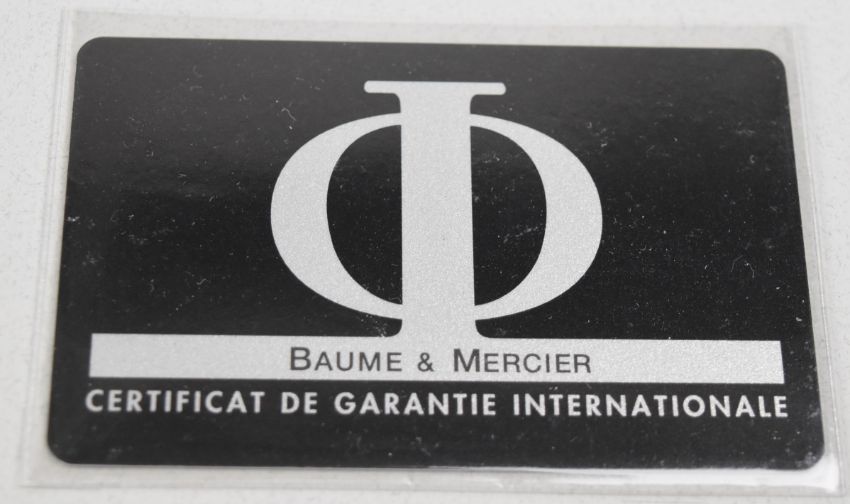 Baume & Mercier Hampton gentleman's automatic wristwatch ref. MV045120 with date aperture, silver hands, Arabic numerals and dial, stainless steel case and signed movement, on brown leather strap, case diameter 24mm, serial number 2901561, in original box with guarantee card, booklet and outer card box.