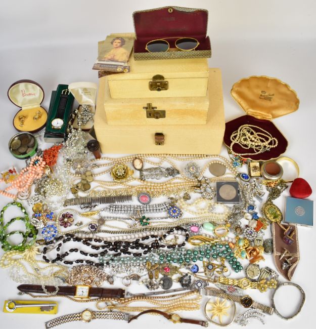 A collection of jewellery including coral necklace, vintage brooches including cameo, Hollywood and filigree horse shoe, watches, diamanté necklaces, etc
