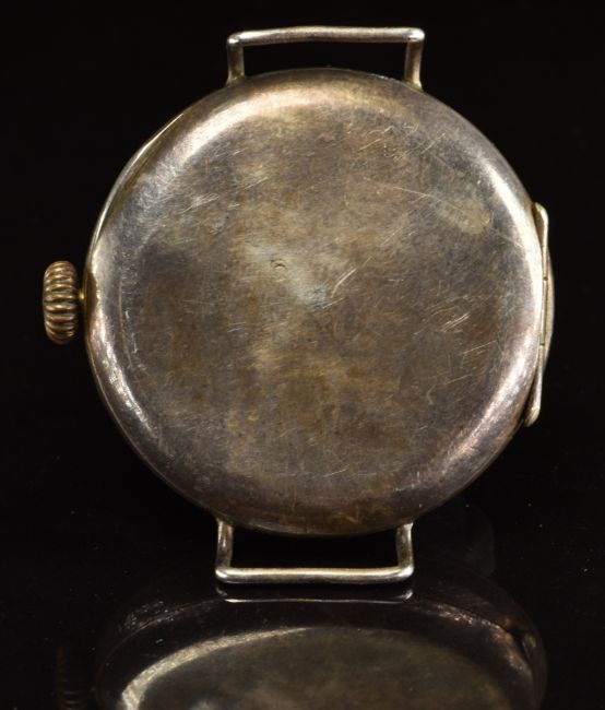 Military silver trench style gentleman's wristwatch with subsidiary seconds dial, Arabic numerals, black and white dial and Swiss mechanical movement, case diameter 32cm, serial number 4104