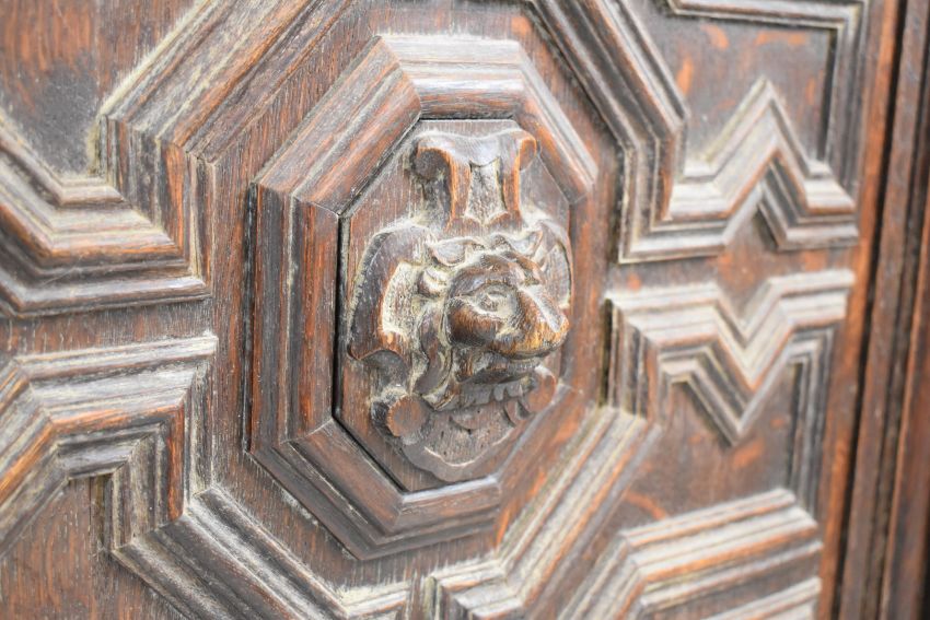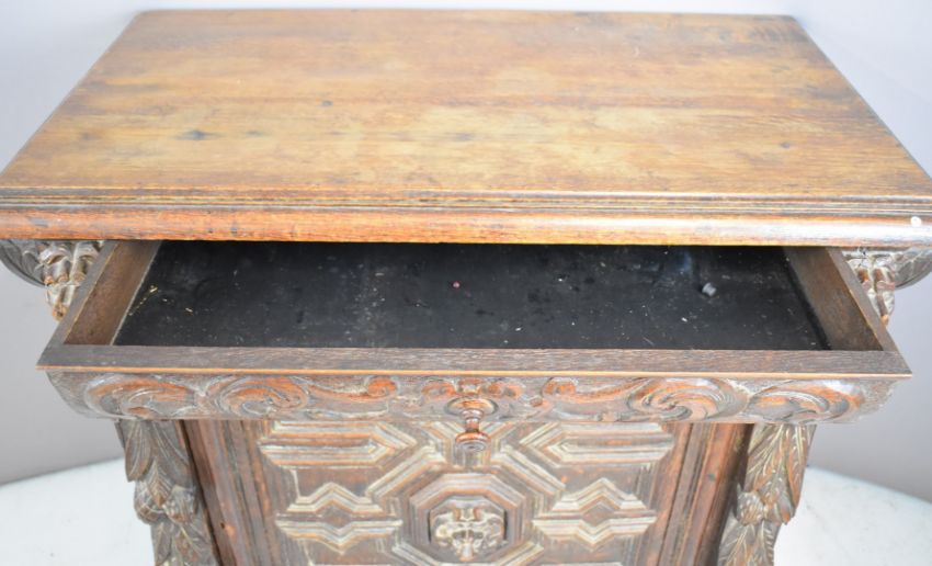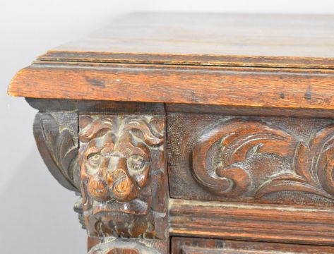 Victorian carved oak cabinet with single drawer above cupboard, with lion mask decoration, W97 x D52 x H110cm