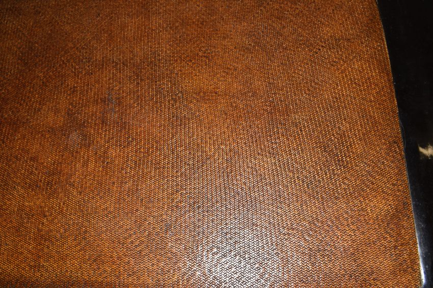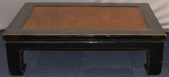 Chinese lacquered coffee table with wicker style centre panel, L150 x W100 x H46cm