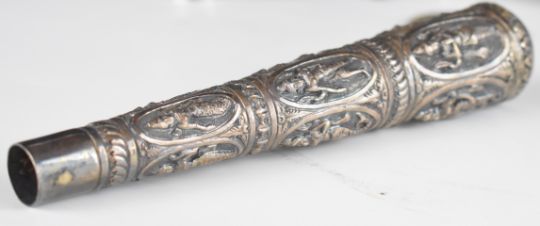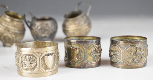 Eight Indian and similar silver and white metal items including cruets, parasol handle (17cm long), bracelet, coin, thimble etc.
