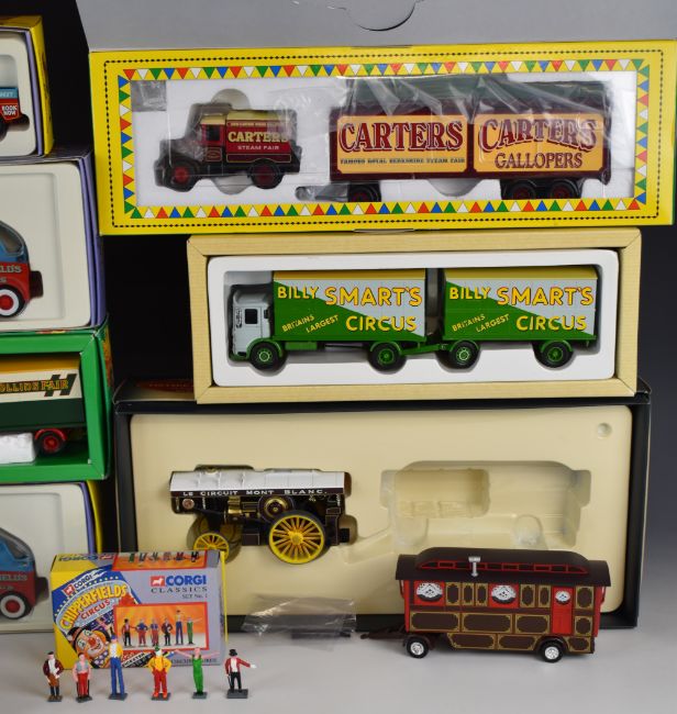 Ten Corgi diecast model circus and showman vehicles to include Billy Smarts AEC Mercury Truck & Trailer 97891 and Scammell Constuctor Cannon & Ringmaster 17801, all in original boxes.