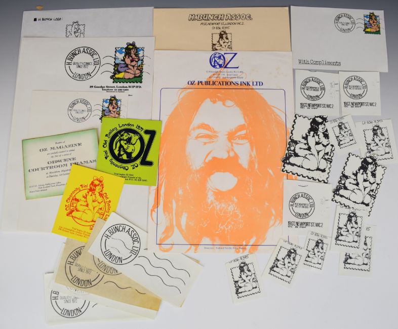 Oz magazine anti establishment counterculture headed notepaper, invitation to Obscene Court Room Dramas, two stickers etc