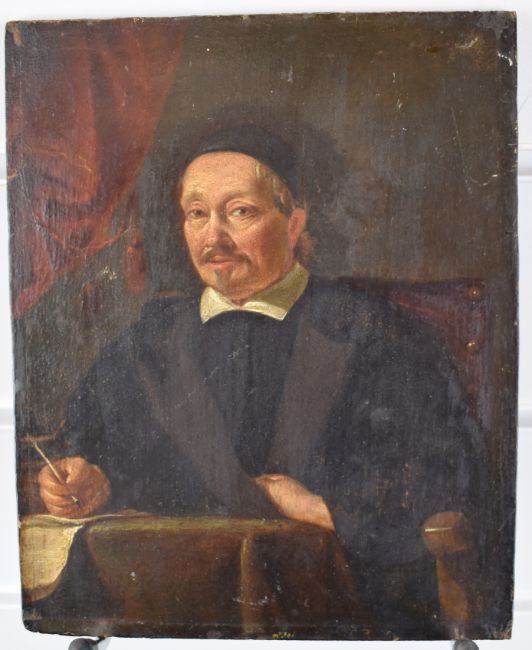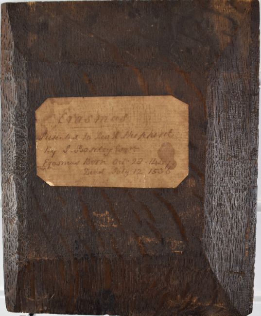 After Hans Holbein, Old Master school oil on panel portrait of Erasmus of Rotterdam writing, with label verso giving title and also details of it having been given to Rev. R. Shepherd by S. Boseley Esq and with Erasmus' dates of birth and death, 18.5 x 15cm