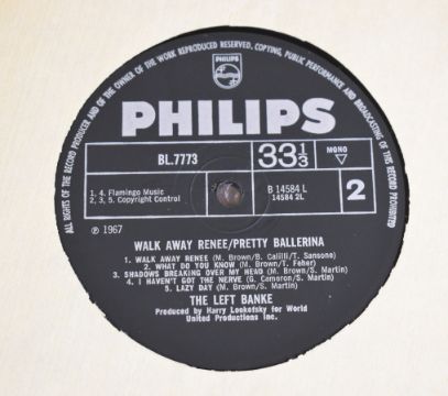 The Left Bank - Walk Away Renee / Pretty Balerina (BL7773), records appears VG damage to cover bottom right, with name label to rear. From the estate of music journalist Miranda Ward