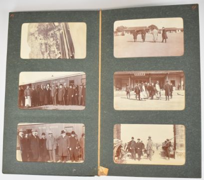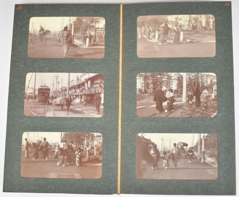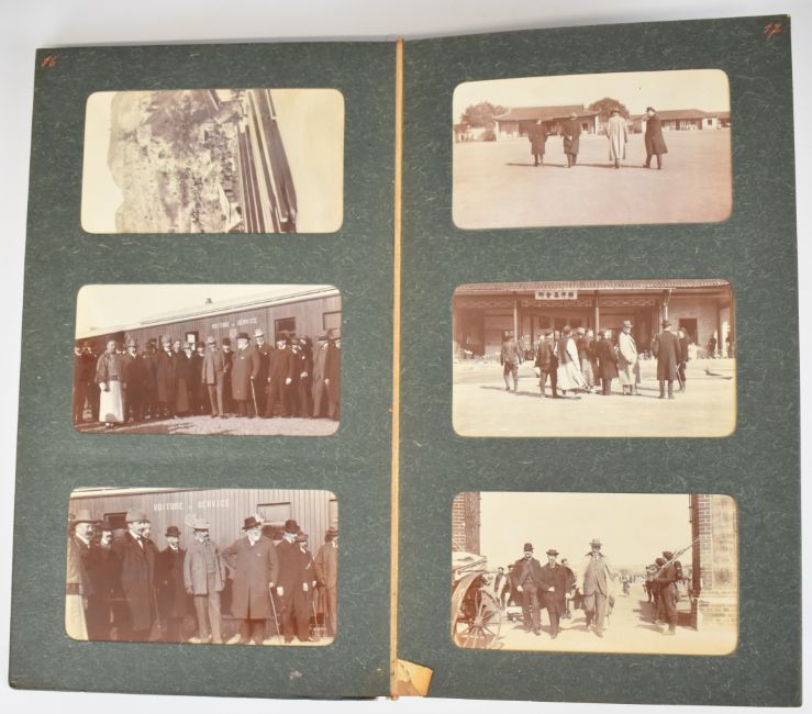 An album of early 20thC photographs forming a record of a journey made c1900 to countries in the Far East, compiled by a possibly Belgian traveller, with key to all contents handwritten in French. Countries and subjects featured include: China including junks on the China Sea, life on the Yangtze, local scenes in WuHu, Hankou scenes including the river Han, a train stop with Mandarin Chinese, bridge on the Yellow River and condemned Chinese prisoners, Peking, Manchou woman, Lambert Jadot (Belgian civil engineer, 1875-1907) aboard a train, inauguration of the railway, sacrifice to the dragon of the Yellow River, Wao Chang with named companions possibly Prudhomme, Hallet and Frequet, aboard the Kiang Wu from Hankou to Shanghai with M. Jadot and Julien Japan including Japanese men and women at Nagasaki; Kobe; Kyoto; Tokyo including the Imperial Palace, soldiers, cavalry and General Kuroki; Yokohama scenes etc On board the White Star Line SS Coptic including storm conditions and Japanese emigrants performing jujitsu Additional individual photographs include Honolulu from the sea; cinnamon garden, Colombo, Sri Lanka; Belgian embassy/legation, Peking; Japan, October 1912; Foochow pagodas;  Nanking Road, Shanghai 1908; Peking temple and gardens 1908, 1911 and 1912; Peking Zoological Gardens, summer 1912; Tsingtau May 1912; Consul General of Belgium, Seoul; Hozugawa river, Kyoto 1911 and Zhongshan 1911 Also included is a four part panorama of Seoul, c 1900-1910, with annotations in French showing the location of the various embassies, total length 56cm