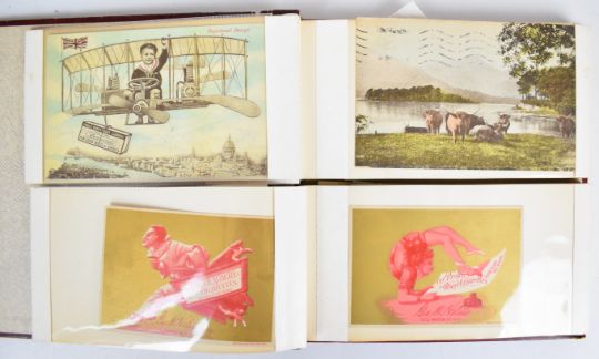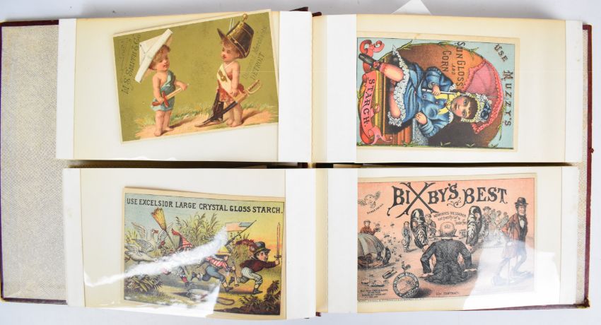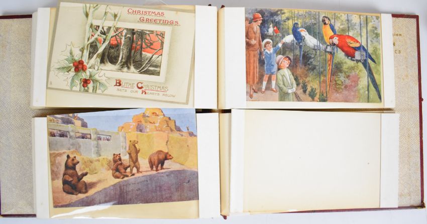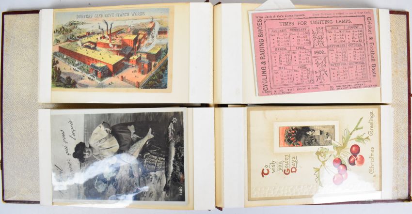 Postcard albums with cards including advertising Prince Albert cigarettes, Van Stan's Stratena cement (glue), Excelsior Starch, Duryeas Glen Cove Starch, Bixby's Best, various zoos, Poor Law Conference, Buxton Town Hall, M.S Smith and Co Diamond Merchants, Detroit, Cash and Co Coventry Cycling and Racing Shoes yearly calendar, 'Times for Lighting Lamps 1906' etc