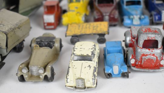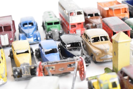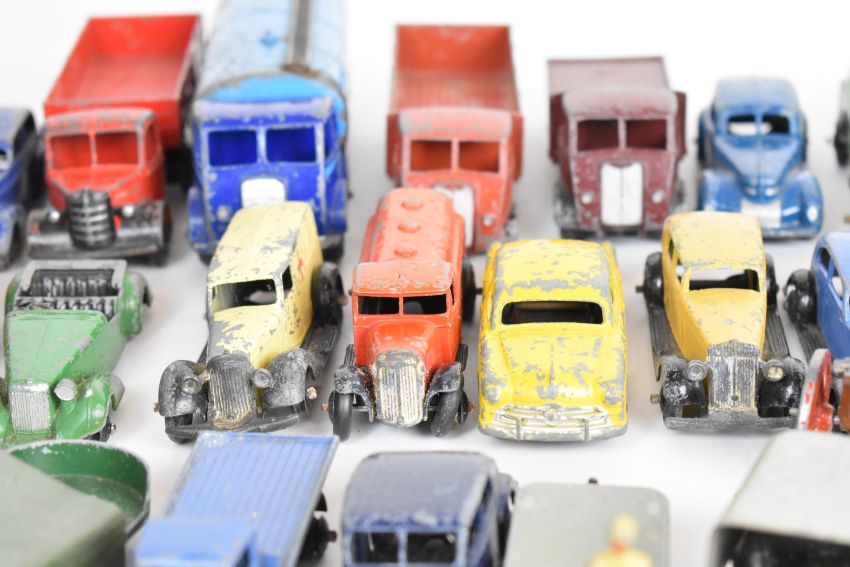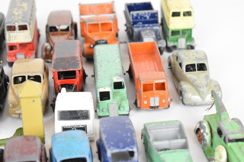 A collection of over forty mostly Dinky diecast model cars and trucks to include Triumph, Ford Sedan, Vanguard, Petrol Tanker and Studebaker.