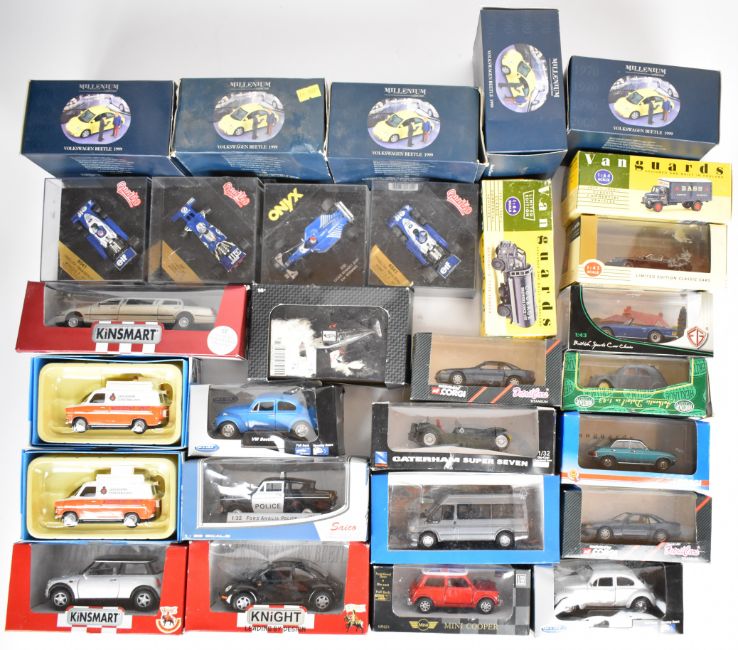 Twenty nine diecast model cars and trucks, manufacturers include Onyx, Heritage Classics, Vitesse, New Ray, Welly and Saico, all in original boxes.